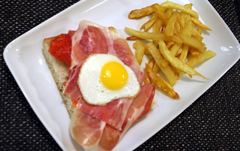 Tapas en plato: montadito de jamón con huevo de codorniz, salmorejo con virutas de Jamón, Berenjenas con miel de caña , Brocheta de sepia al aceite de perejil, pinchitos de cerdo marinados, pollo al curry con manzana y piña, patatas a lo pobre con huevo de codorniz, croquetas de jamón con patatas fritas.